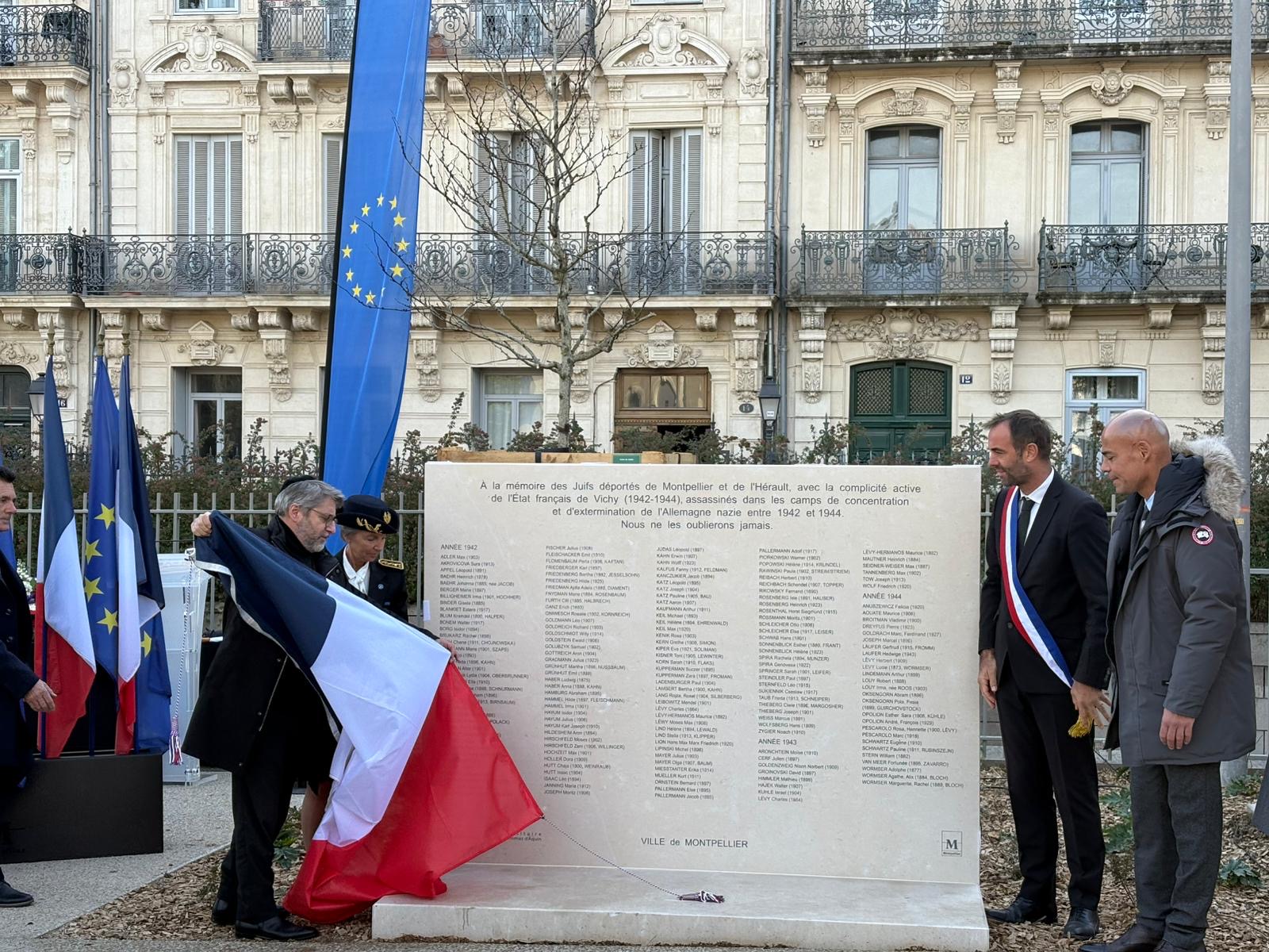 Dévoilement de la Stèle à la mémoire des Juifs déportés de Montpellier et de l’Hérault, par Michaël Delafosse, Maire de la Ville de Montpellier et Président de Montpellier Méditerranée Métropole, Michaël Iancu, directeur de l’Institut Maïmonide et délégué régional du Comité Français pour Yad Vashem, et en présence de Haïm Korsia, Grand Rabbin de France et Véronique Martin Saint-Léon, Secrétaire générale de la Préfecture de l’Hérault, le dimanche 30 novembre dernier, place de la Légion d’Honneur à Montpellier. Une liste qui n’avait jamais été constituée auparavant. Un devoir de mémoire et d’histoire de la Shoah, en cette année marquant le 80e anniversaire de la libération des camps nazis.