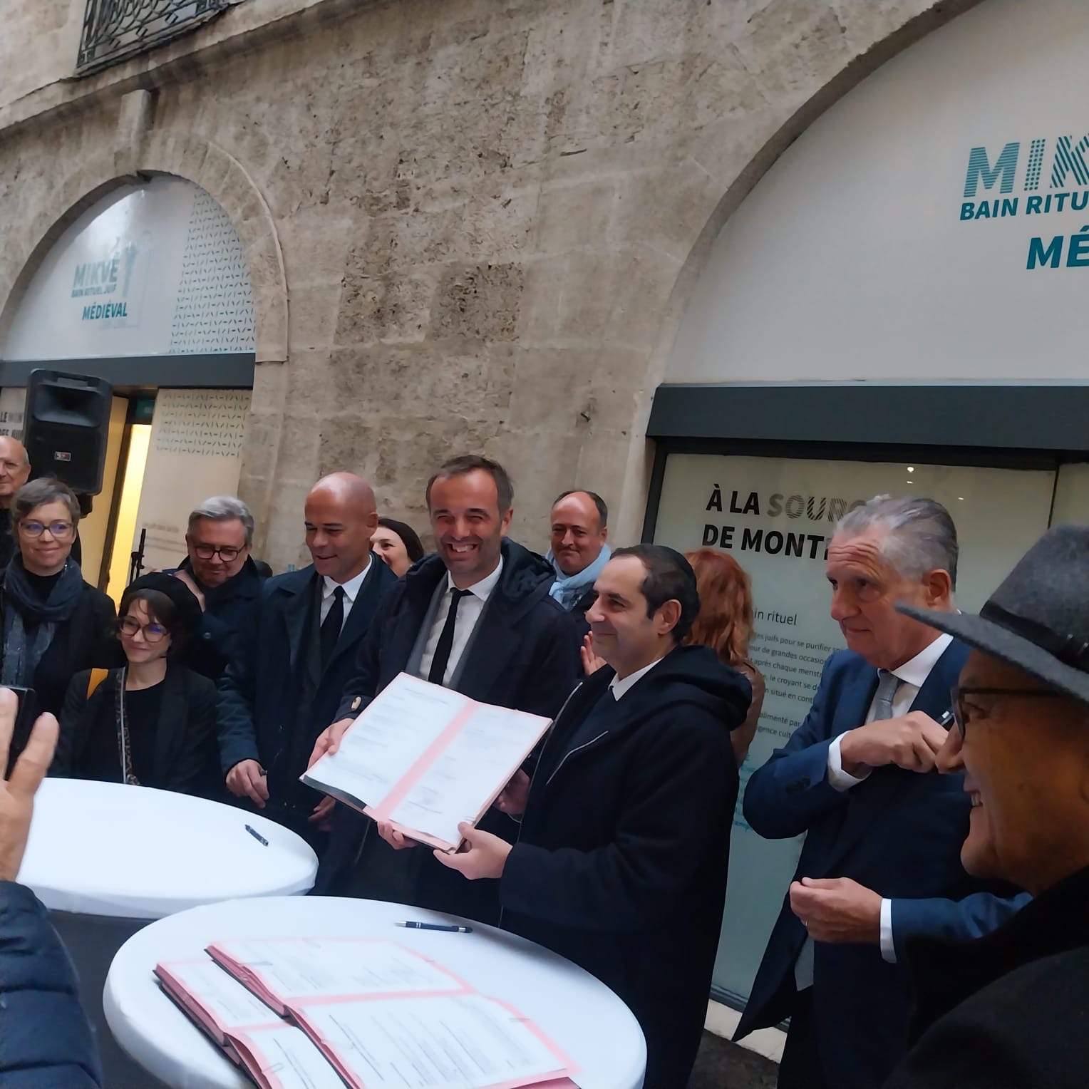 Montpellier était une place forte de la science juive au Moyen Âge. Les mosaïstes languedociens ont joué un rôle prééminent dans la transmission du savoir entre l’Ibérie musulmane et la Chrétienté féodale: apport à la science du judaïsme (Talmud, Kabbale), apport aux sciences exactes (philologie, médecine). Cette histoire glorieuse se devait d’être pérennisée, d’autant plus avec un bâtiment « Monument historique » qui renferme les vestiges d’un Espace synagogal de tout premier plan, dont le bain rituel juif du XIIe siècle. C’est chose faite grâce à Michaël Delafosse, Maire de la Ville de Montpellier, Elie Korchia, Président du Consistoire Central de France, Alain Zylberman, Président du Consistoire Régional et Michaël Iancu, Directeur de l’Institut Maïmonide. Ils ont signé une convention quadripartite (Ville, Consistoire Central, Consistoire Régional et Institut Maïmonide), Michaël Delafosse et Elie Korchia ayant su relancer un projet muséal exceptionnel avec force et détermination.